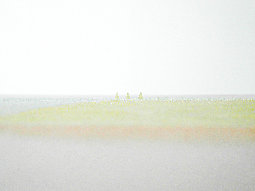 An exhibition of a large garden plan. With sprawling views of grasses, flowers, trees, sand, stones, and sky, it provides a revealing look at our present day lives. The acrylic stones placed throughout reflect the light, imbuing the whole place with a lustrous shine. The clear and transparent landscape seems to go on forever.