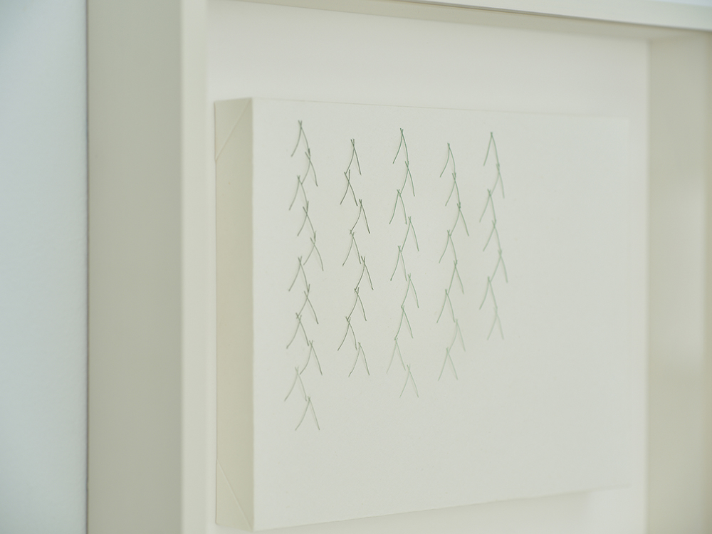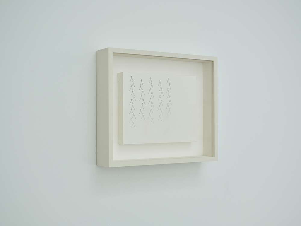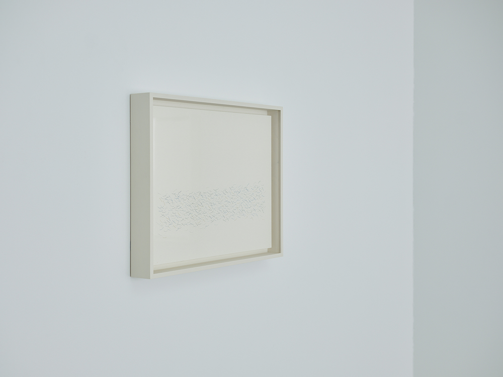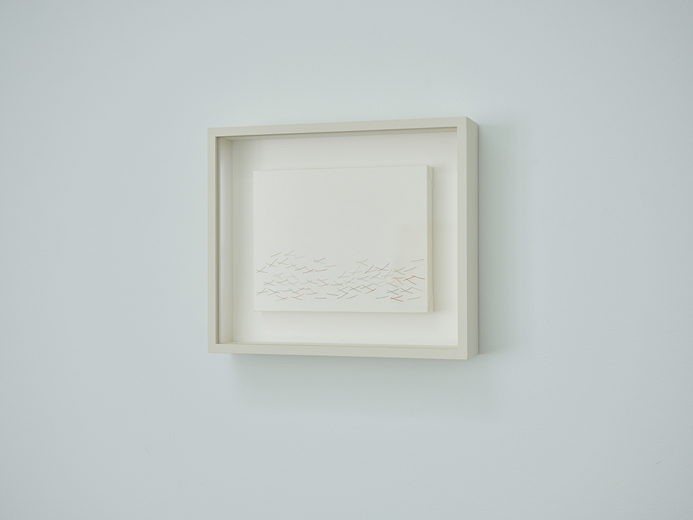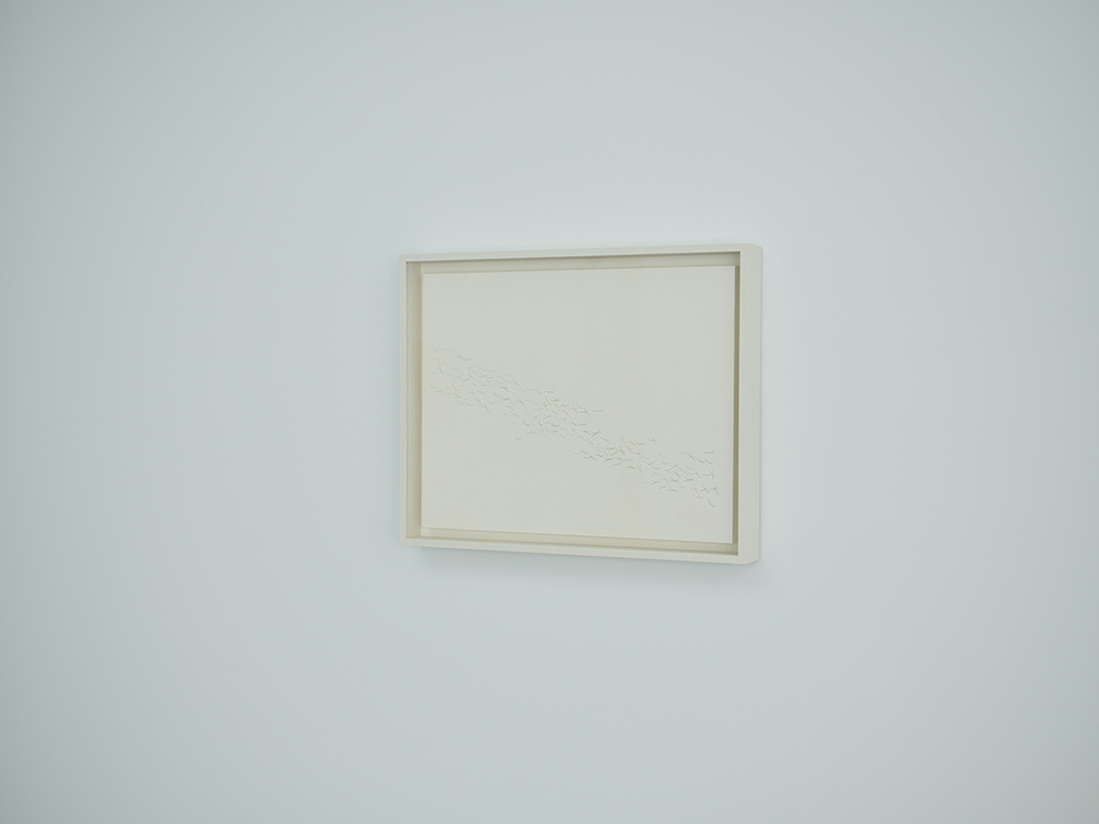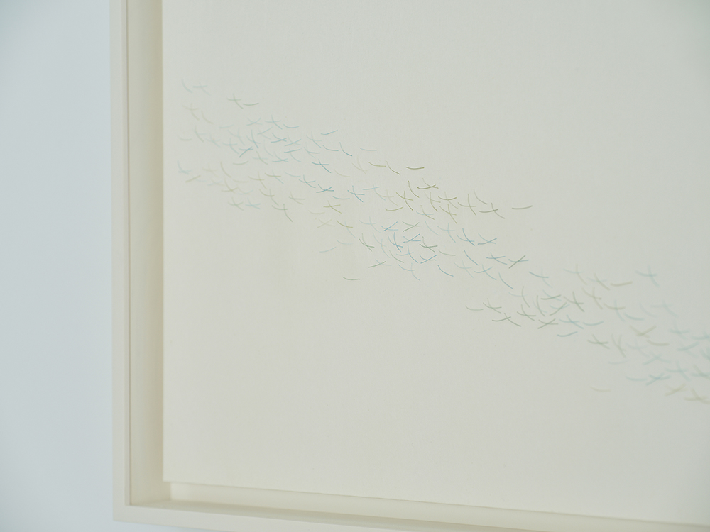 The works are landscape paintings made by finely cutting up pieces of washi paper colored using mineral pigments and earth pigments, and assembling the pieces in a semi-three-dimensional manner atop the canvases. The shadows and depth created by the raised pieces of paper lend a calm presence to the canvases. Drawing inspiration from the realization that a Japanese-style garden is a landscape painting created using nature and from the gardener's stance of creating the garden through the accumulation of small deliberate acts, the works explore expression that lies between the painting and the creation of landscapes, quietly connecting the acts of seeing and making.