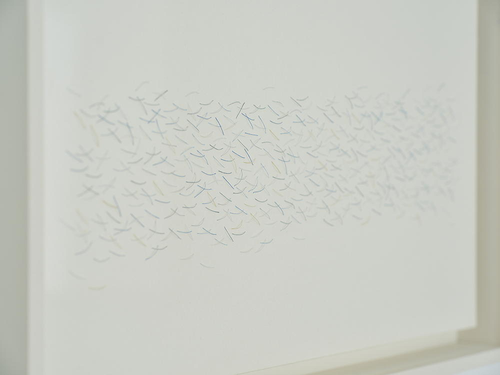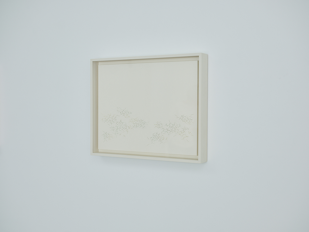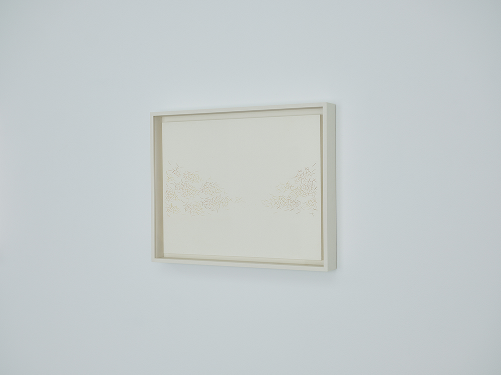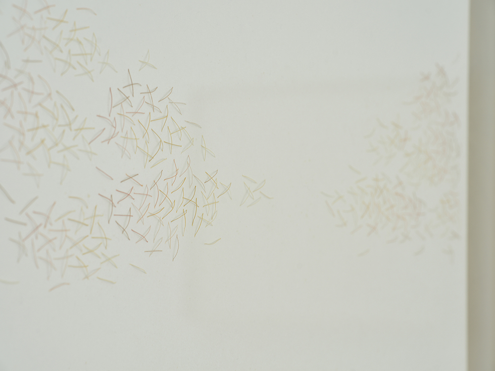 The works are landscape paintings made by finely cutting up pieces of washi paper colored using mineral pigments and earth pigments, and assembling the pieces in a semi-three-dimensional manner atop the canvases. The shadows and depth created by the raised pieces of paper lend a calm presence to the canvases. Drawing inspiration from the realization that a Japanese-style garden is a landscape painting created using nature and from the gardener's stance of creating the garden through the accumulation of small deliberate acts, the works explore expression that lies between the painting and the creation of landscapes, quietly connecting the acts of seeing and making.