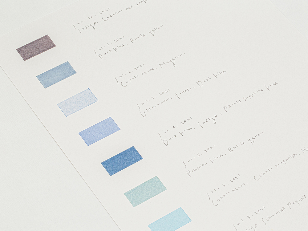 Each day, I create the color of that day's seascape using watercolors, then paint it on a small piece of paper, recording it, like a diary. Thinking about the vast ocean that is not there before my eyes, creating color with paint, and putting that color onto paper makes me feel that the atmosphere of the sea that day is right there on the paper. This is an experimental work in which I create a shifting personal atlas of landscapes of the sea as I also question the notion of the landscape.